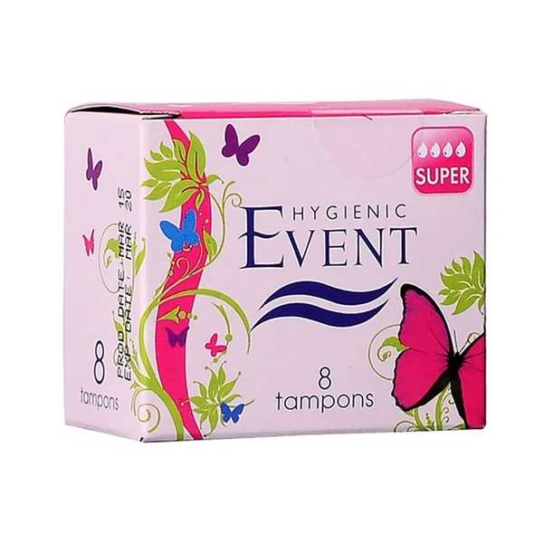 Тампоните EVENT са изработени от попиващи естествени влакна. Тяхната форма от осем нагъвки позволява равномерно разширяване на тампона, което повишава неговия попиващ ефект и надеждност. Благодарение на заобления връх и допълнителната обложка, осигуряващи по-голяма компактност и гладкост на тампона, поставянето му е лесно и безопасно.