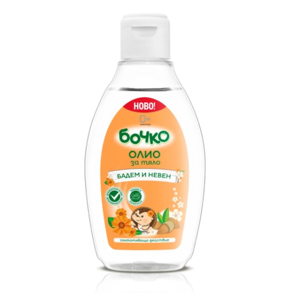 Бебешкото олио за тяло Бочко е създадено за нежен и успокояващ бебешки масаж, с натурални масла от сладък бадем, маслина и слънчоглед, които спомагат за лесно нанасяне и бързо попиване, подхранват и поддържат деликатната бебешка кожа. Вложеният екстракт от невен действа успокояващо и възстановяващо. Идеално за употреба след баня. Предпазва кожата от изсушаване.